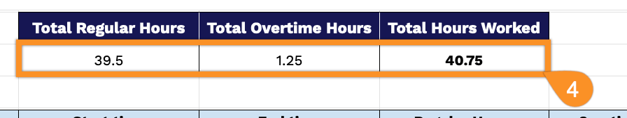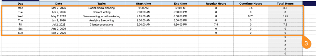 4. The template will automatically calculate Total Regular Hours, Total Overtime Hours, and Total Hours Worked as you fill in your daily entries.