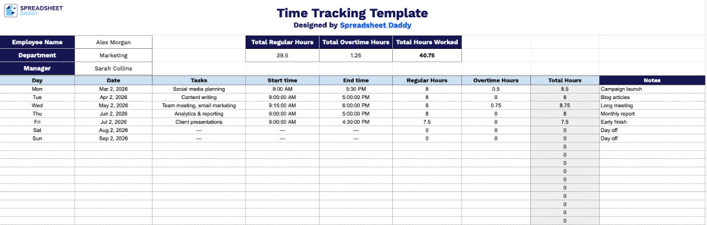 Download it in Google Sheets, Excel, or PDF to quickly log hours, tasks, and notes.
