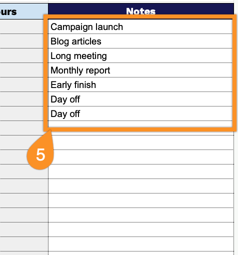 5. Use the Notes column to record any special circumstances, delays, unexpected tasks, or reminders for tasks that need follow-up.