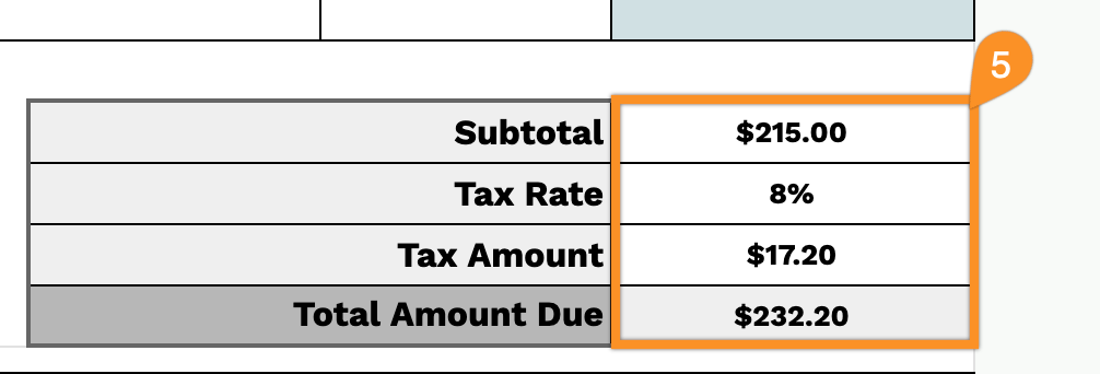 5. Set the applicable tax rate, and the template will calculate the subtotal, tax, and total amount due.