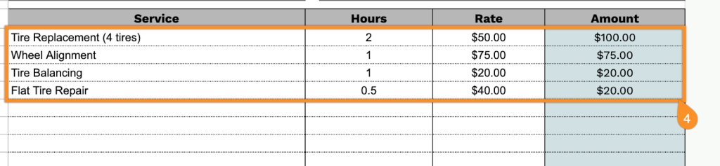 4. List the tires or services provided, including quantity and price for each item—the template will automatically calculate the line totals.