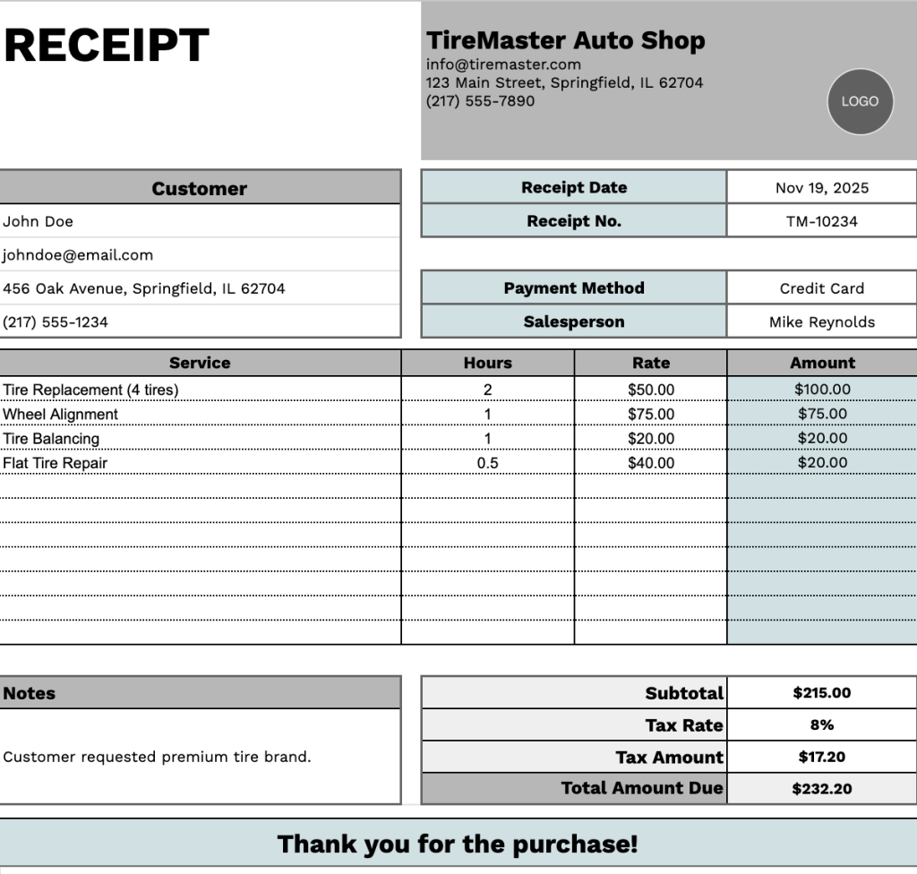 Free☝️ Tire Shop Receipt Template (Google Sheets, Excel, Word, Google Docs, & PDF Downloads)