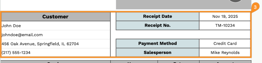 3. Fill in the customer’s information, along with the receipt date, receipt number, salesperson, and payment method.