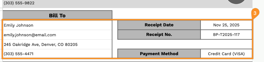 3. Fill in the student or payer’s details under “Bill To,” along with the receipt date, receipt number, and payment method.
