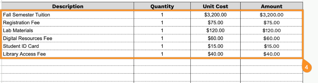 - Detailed itemized expense table with 11 rows: A structured table featuring Description, Quantity, Unit Cost, and Amount columns that allows you to list tuition charges, course fees, registration costs, material fees, or payment installments with precise line-item breakdowns for complete transparency.