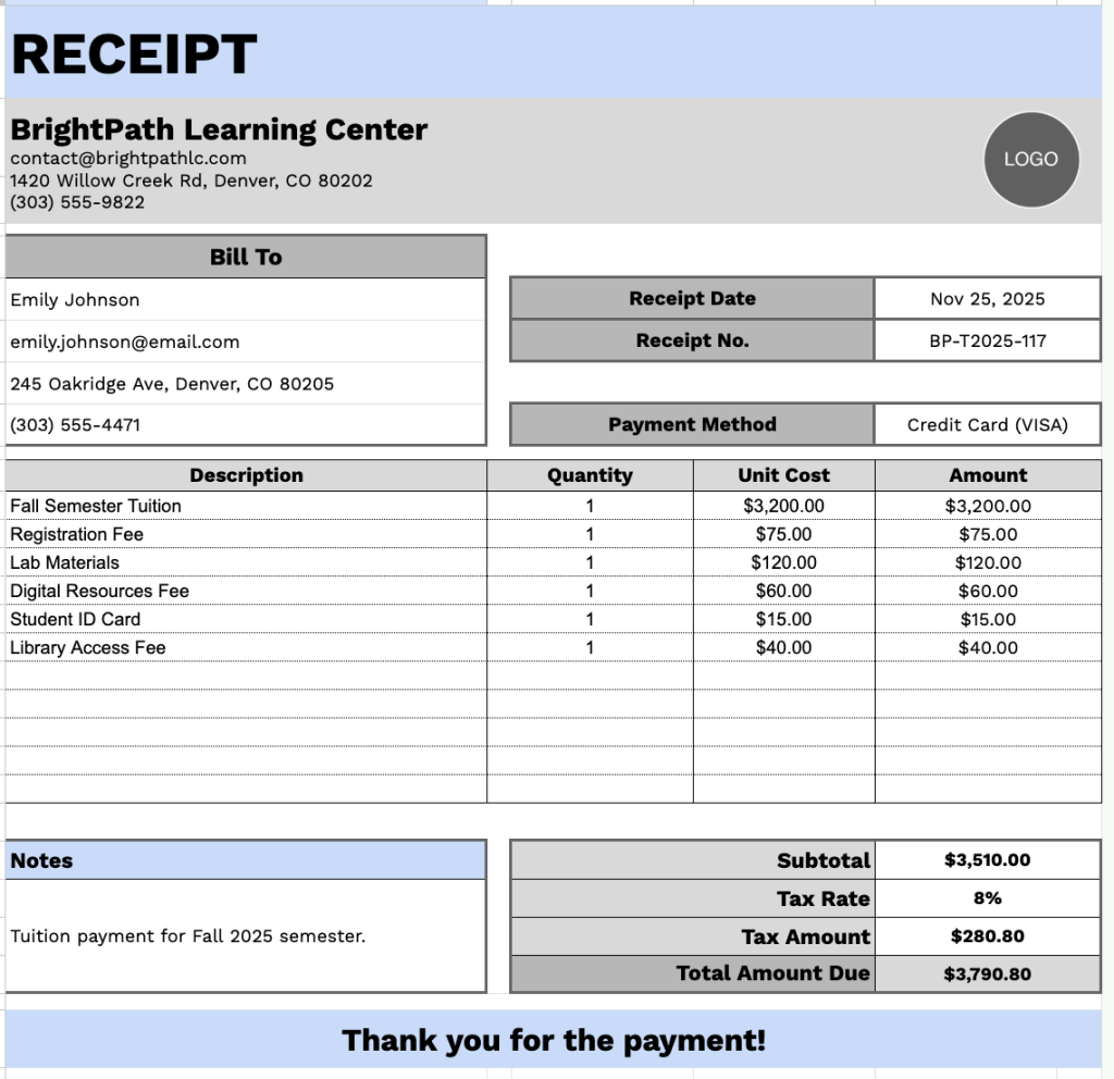 - Comprehensive billing and receipt tracking section: Dedicated fields for student or payer information, including name, email, address, and phone number, along with receipt date, unique receipt number, and payment method designation to maintain organized financial records and transaction history.