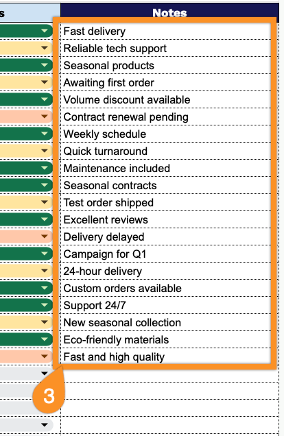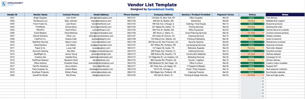 - Status monitoring and notes system: The Status column enables quick visual identification of vendor relationships, complemented by a flexible Notes field for recording key details such as contract renewal dates, performance issues, or special arrangements.
