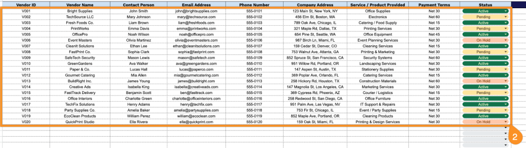 - Service categorization and payment tracking: The Service/Product Provided column allows you to classify vendors by their offerings. In contrast, the Payment Terms field helps you monitor negotiated conditions, ensuring better cash flow management and financial planning.