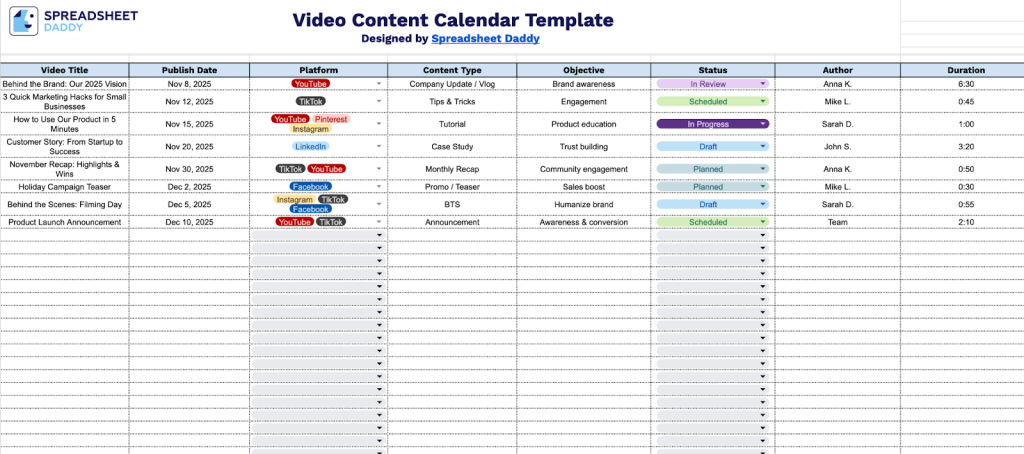 Download Spreadsheet Daddy’s Free Video Content Calendar Spreadsheet
