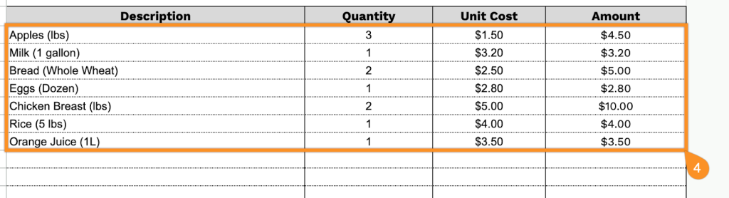 4. Include each item purchased, the quantity, and the price. The template will automatically calculate the line totals for you.
