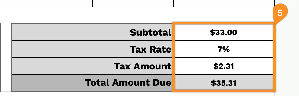 • Automated tax and total calculations: Built-in fields for subtotal, adjustable tax rate percentage, tax amount, and total amount due streamline your financial record-keeping and ensure accurate pricing for each customer transaction.