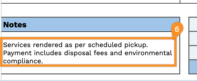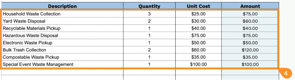 • Itemized transaction table: Contains four columns, including Description, Quantity, Unit Cost, and Amount, allowing you to document multiple waste disposal services, materials, or fees with individual line item calculations.