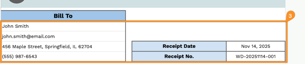 • Dual-column customer billing area: Features a “Bill To” section on the left for client details (name, email, address, phone number) and receipt tracking fields on the right (receipt date and receipt number), ensuring organized documentation and easy reference for both parties.