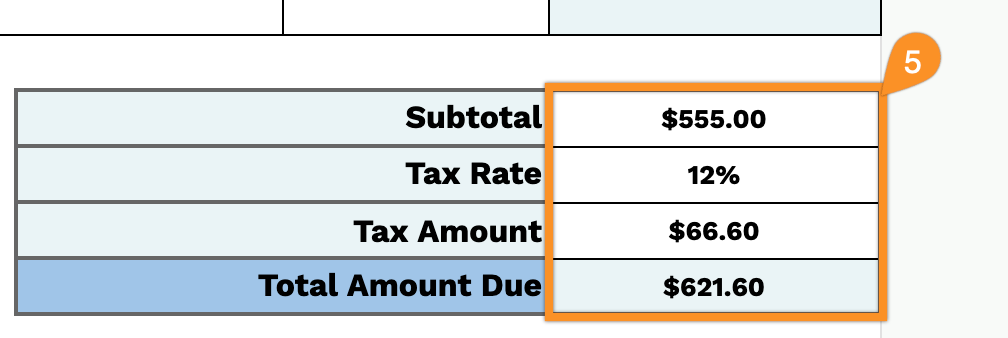 5. Apply any relevant tax rate. The template will automatically calculate the subtotal, tax amount, and total due.