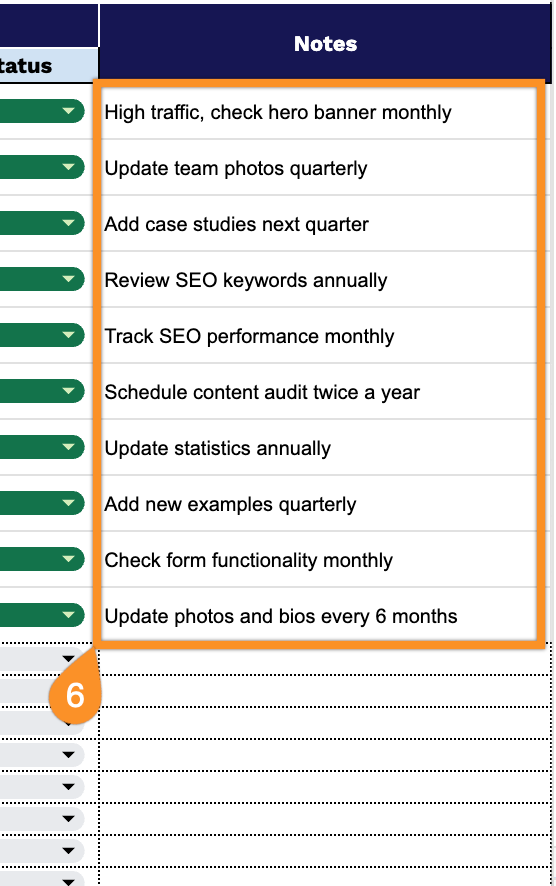 - Publication status and notes: A publication status column helps you see which pages are live, in draft, or archived at a glance. There’s also a flexible notes field where you can capture additional observations, action items, or special considerations for each page.