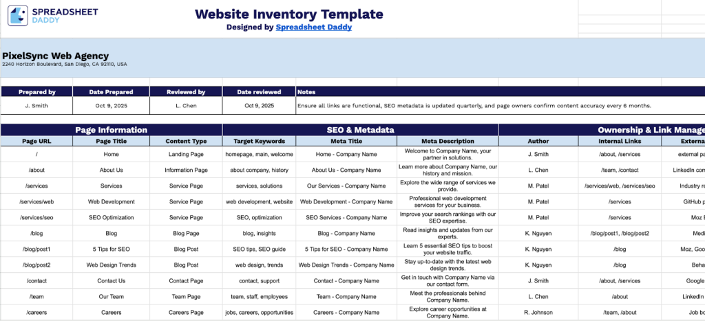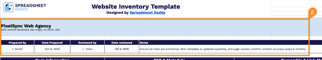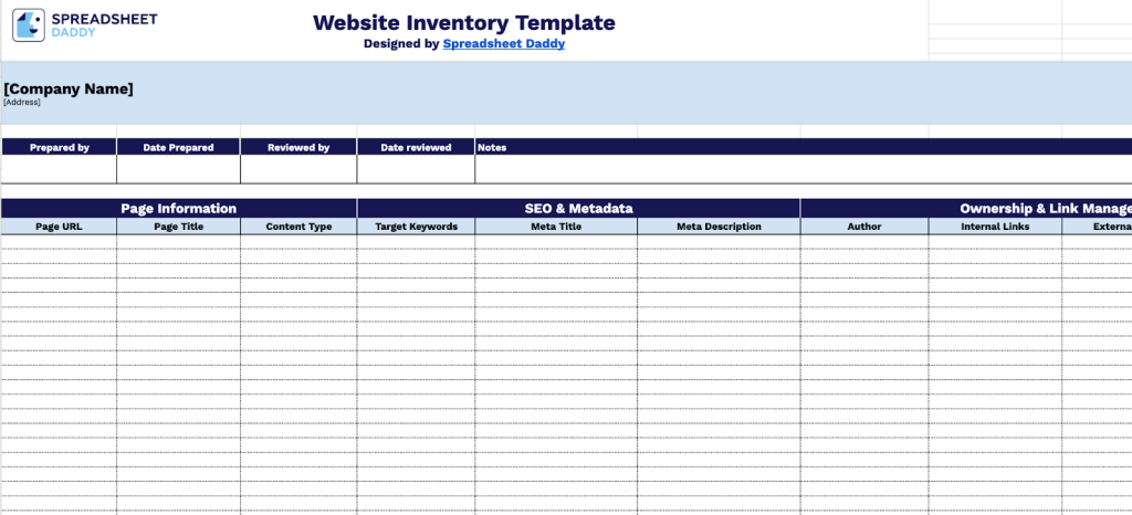 - Comprehensive header section: Customizable fields at the top of the template enable you to add your company name, address, the person who prepared the inventory and when, the person who reviewed it and when, and a space for general notes. This provides you with comprehensive documentation and accountability for your website audit.