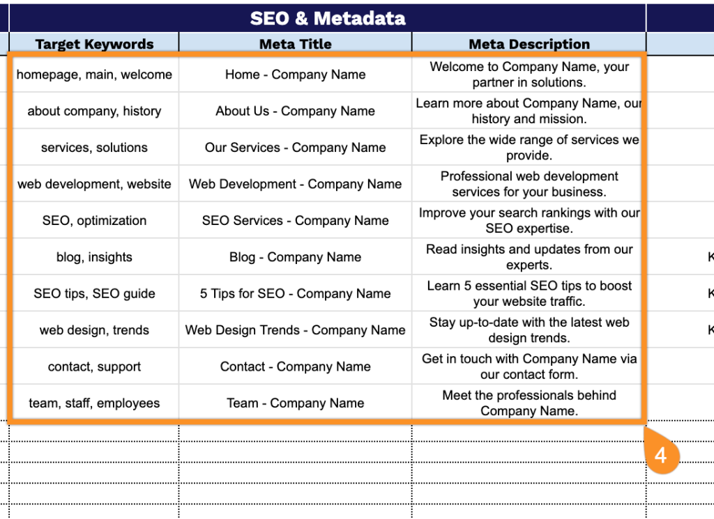 - SEO and metadata tracking: Dedicated columns for target keywords, meta titles, and meta descriptions let you document and optimize your search engine strategy across all pages. This ensures you maintain consistent and effective metadata throughout your entire site.