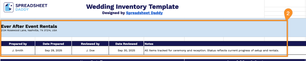 - Header documentation section: Customizable fields for company name, address, prepared by, date prepared, reviewed by, date reviewed, and notes ensure proper documentation and accountability throughout the wedding planning process.