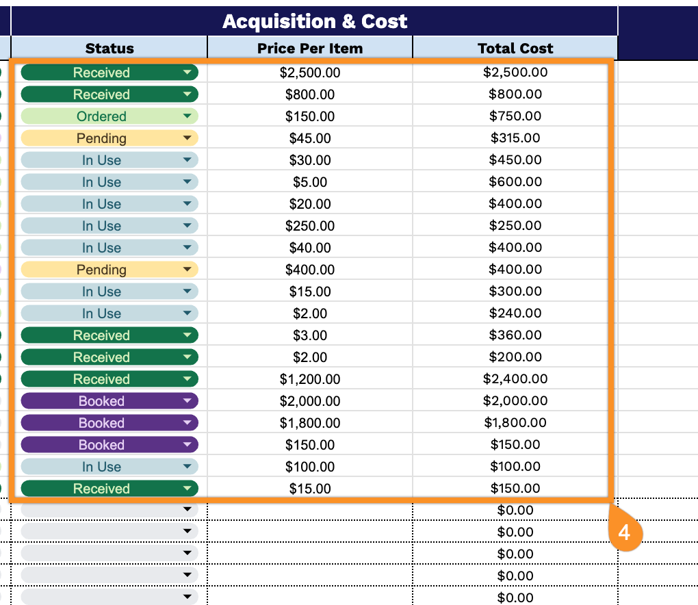 - Status: Indicate whether the item is ordered, received, in use, booked, etc.