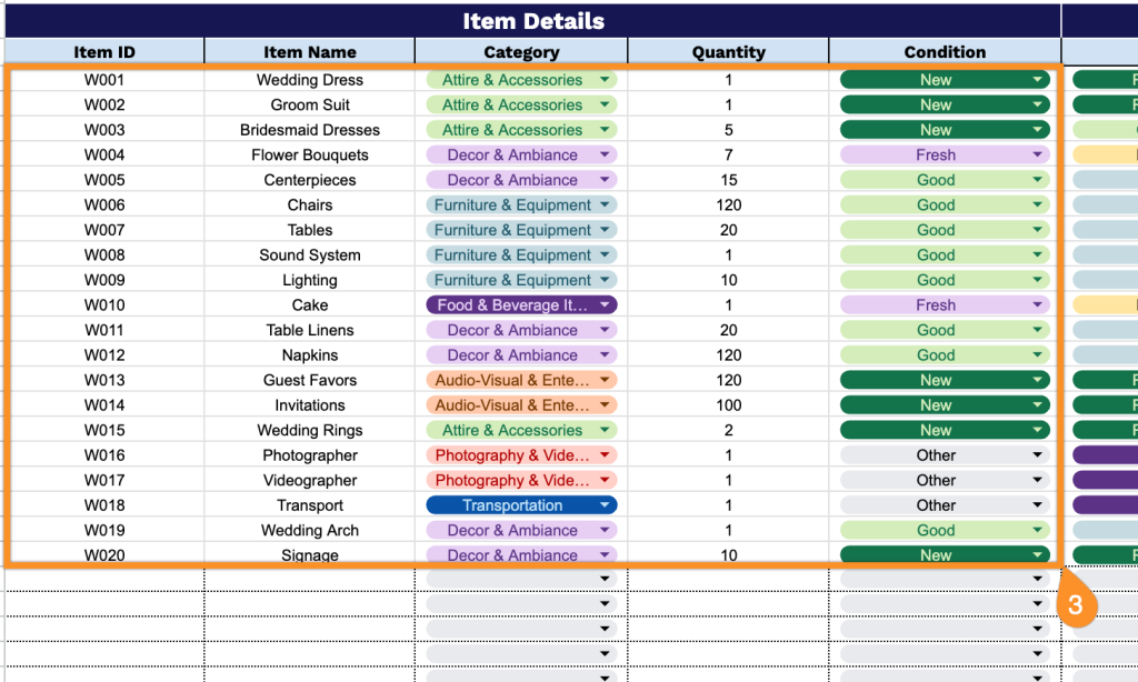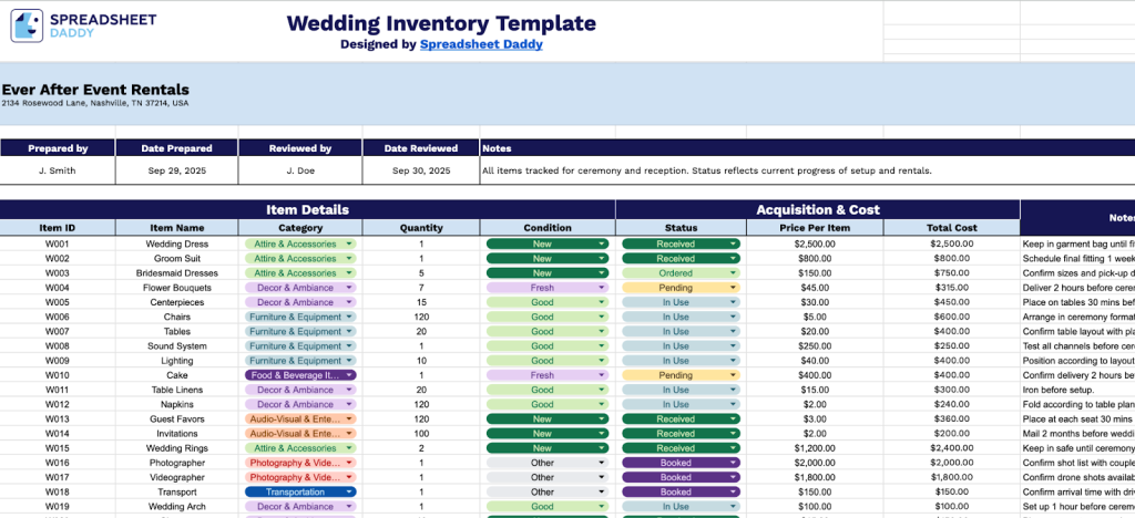 - Comprehensive tracking system: Track all wedding items with dedicated columns for Item ID, Item Name, Category, Quantity, Condition, and Status to maintain complete visibility of your wedding inventory from initial planning through event day.