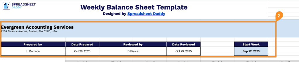 2. Document the business name, address, and who prepared it, plus the preparation date. Note who verified it with their review date, and specify the start week’s date.