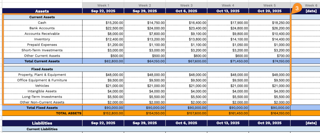 4. Following this, record your Liabilities and Shareholder’s Equity sections by entering weekly figures for every line item. The template will automatically calculate subtotals for current liabilities, long-term liabilities, and the combined total of liabilities and equity.