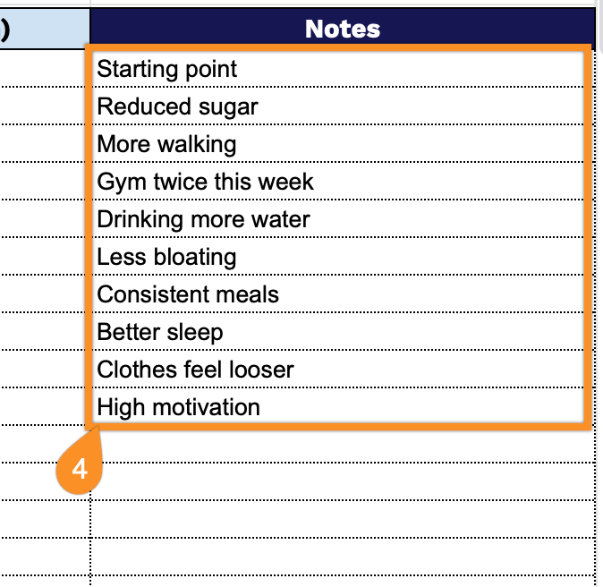 - Notes field for context: A dedicated Notes column allows you to record essential details like workout changes, dietary adjustments, how you felt, or any factors that may have influenced your measurements that day.