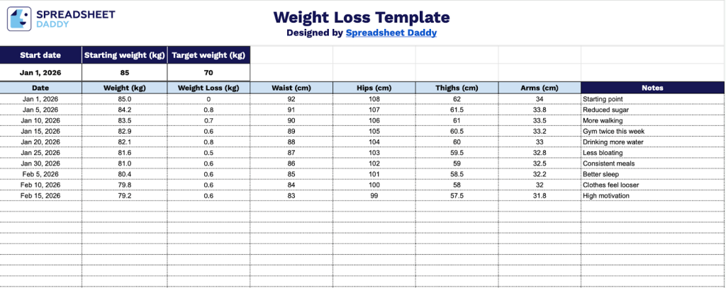 - Progress calculation: Built-in Weight Loss column that automatically calculates the difference from your starting weight, making it easy to see your cumulative progress over time.