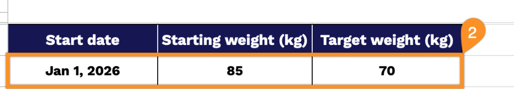 2. Start by entering your starting date, starting weight, and your target weight at the top of the template.