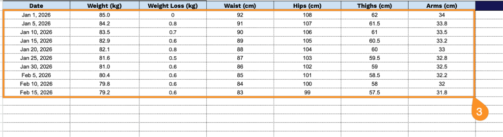 - Comprehensive measurement columns: Track multiple metrics, including Date, Weight, Weight Loss (calculated automatically), Waist, Hips, Thighs, and Arms measurements to monitor progress across different body areas.