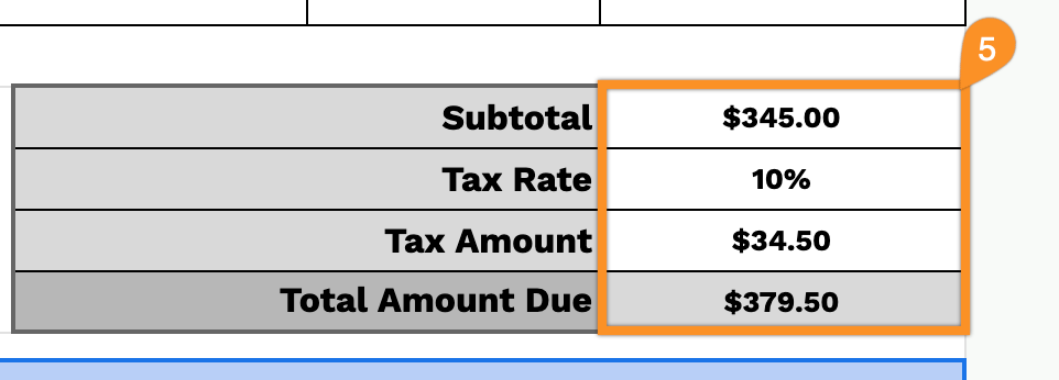 5. Add the applicable tax rate, and the template will calculate the subtotal, tax, and total amount due.