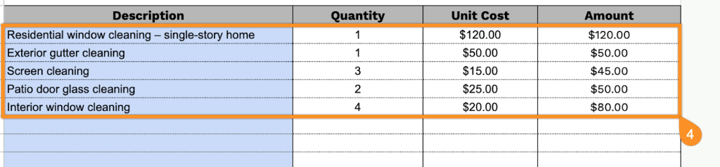 • Multi-row itemization table: A table with columns for Description, Quantity, Unit Cost, and Amount, allowing you to list multiple window cleaning services or add-on charges with a clear pricing breakdown.