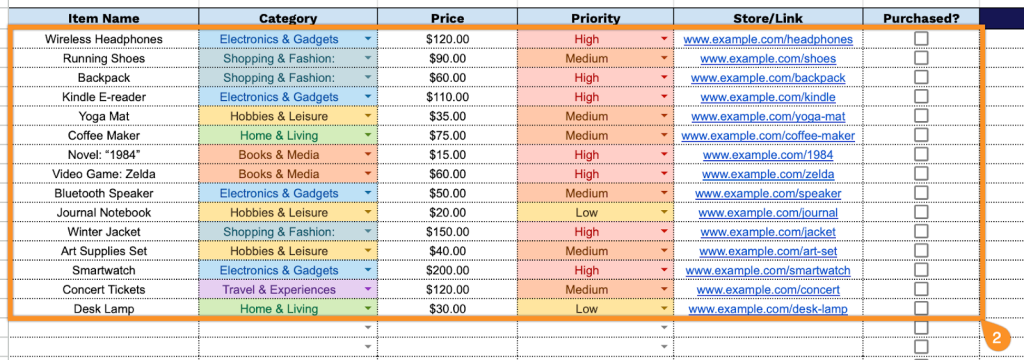 - Priority-level tracking: The Priority column lets you designate items as High, Medium, or Low, helping you focus on must-have purchases rather than nice-to-haves and strategically plan your budget based on what matters most.