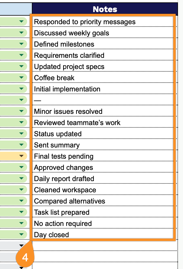 - Notes section for additional context: Each task row includes a Notes column where you can add important details, observations, or follow-up reminders about specific activities, ensuring comprehensive documentation and better reference for future planning or reporting needs.