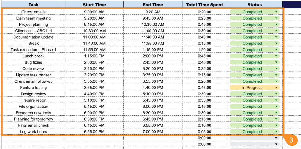 - Comprehensive time-tracking columns: The main table includes dedicated columns for Task description, Start Time, End Time, and Total Time Spent, enabling you to accurately monitor how long each activity takes and maintain detailed records of your daily work hours.