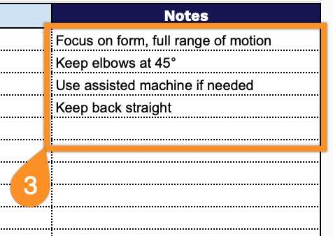 3. Use the Notes section to record how you felt during the workout, progress observations, injuries or soreness, skipped sessions, or adjustments to your plan for future workouts.