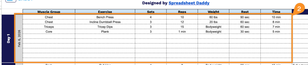 - Date: Enter the specific date for each workout day to track your training schedule.
