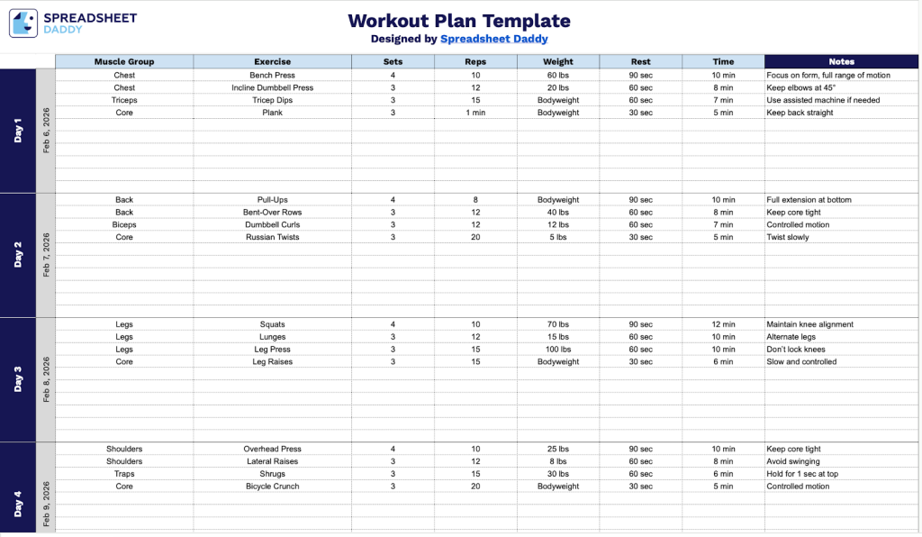 - Time: Track the duration allocated for each exercise or the total workout session.