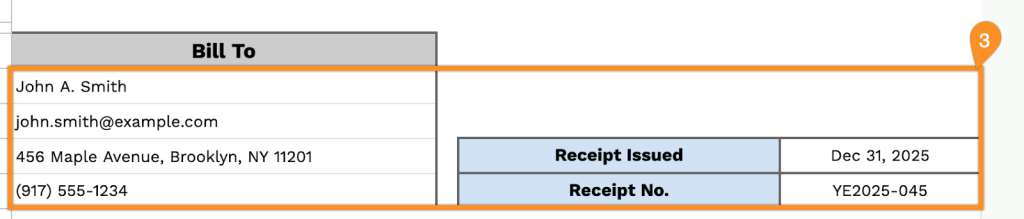 3. Fill in the donor’s information under “Bill To,” along with the receipt issue date and receipt number.