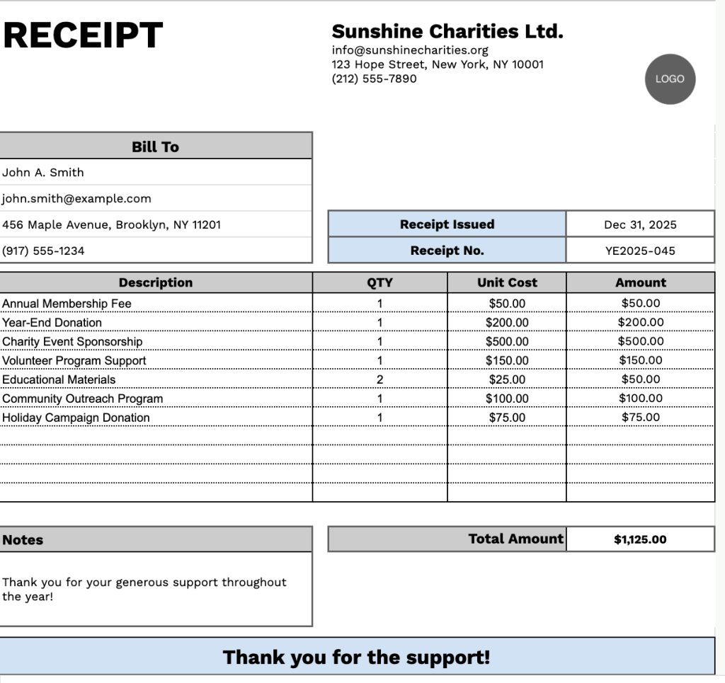 Our free, editable Year-End Donation Receipt Template works in Excel, Google Sheets, Word, and PDF, making it easy to record contributions and provide donors with a polished receipt. Perfect for nonprofits, schools, or community organizations.