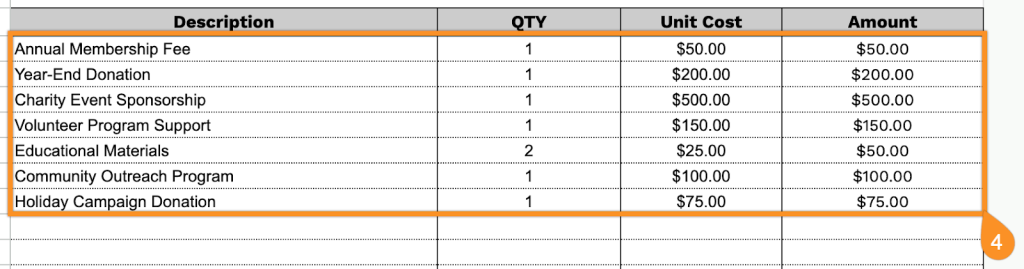4. List the donated items or contributions, including quantity and value for each. The template will automatically calculate the line totals.